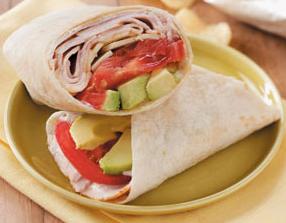 Spread over tortillas. Layer with turkey, cheese, avocado and tomato.