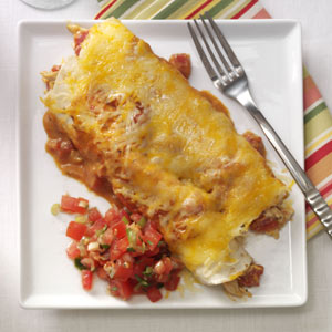 Place 1/3 cup chicken mixture down the center of each tortilla. Roll up and place