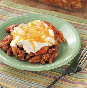 -Drain the pasta; stir into beef mixture. Transfer to a greased 13-in. x 9-in. baking dish.